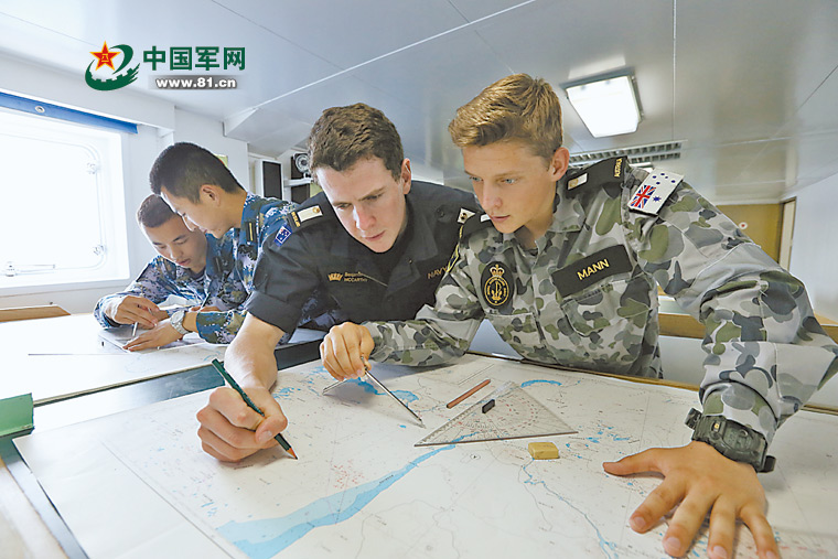 11月12日,中外海军学员在郑和舰标绘海图。据悉,此次远洋实习,将有数名外军学员在中途登上郑和舰,与我军学员共同参与训练。颉宇坤摄