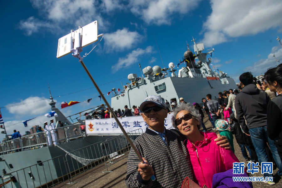 11月20日,在新西兰奥克兰,两名老人在中国海军盐城舰前合影。