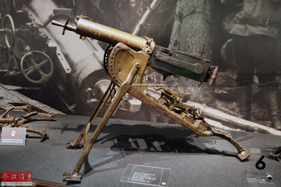 进到博物馆的室内展区,这里主要以各种枪械展品为主。图为一战期间著名的M1908 15式马克沁重机枪,使用7.7毫米弹药,最高射速每分600发,采用250发帆布弹带供弹,有效射程1000多米。