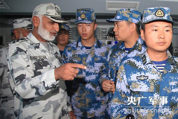 图为巴基斯坦海军参谋长扎考拉上将来到邯郸舰观摩演练。韩丰军 摄