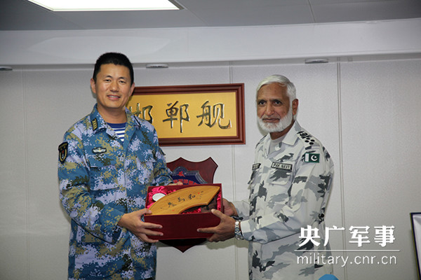 图为巴基斯坦海军参谋长扎考拉上将与中方指挥员迟庆涛交换礼物。韩丰军 摄