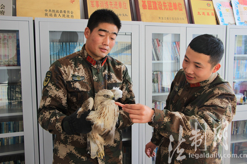 图为边防官兵给受伤毛脚鵟喂食 刘加一摄
