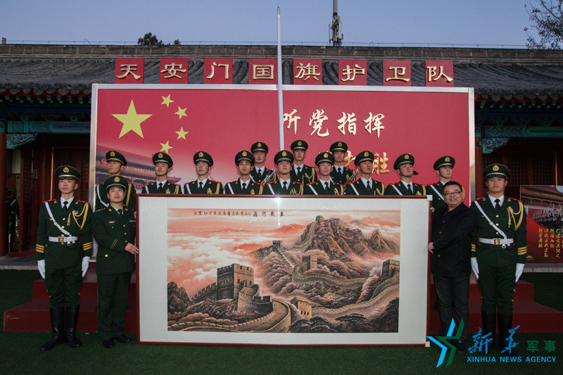 新华网北京11月24日电(刘芳)23日,国家一级美术师、中国书画家协会秘书长、著名国画家薛海涛向天安门国旗护卫队捐赠了其精心创作的巨幅国画《巨龙腾飞》。