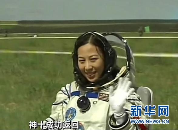 神十航天员王亚平挥手致意。当日,神舟十号载人飞船返回舱在内蒙古主着陆场成功着陆。 新华社发(视频截图)(资料图片)