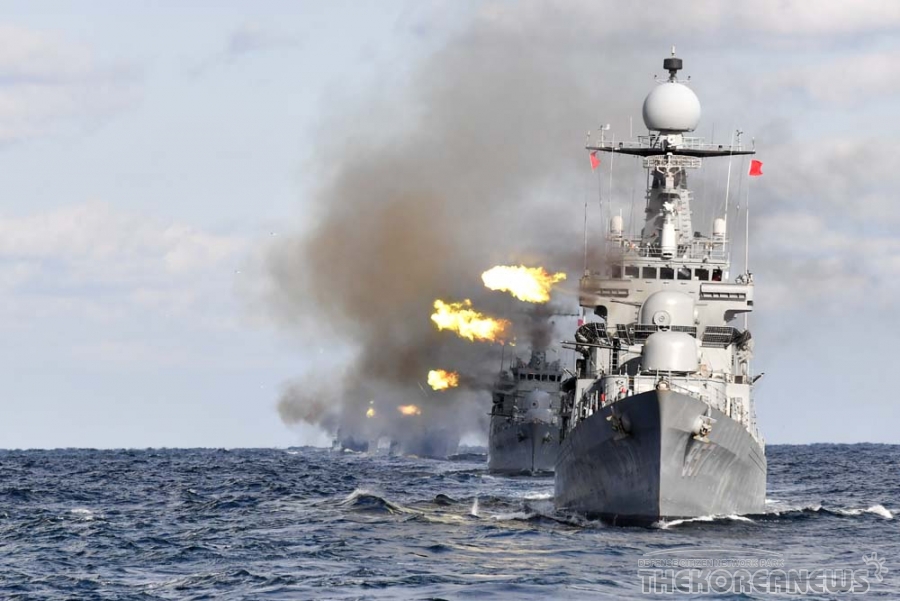 近日,韩国举行一场海上演练,多艘军舰排成一列开火,场面壮观。