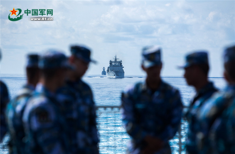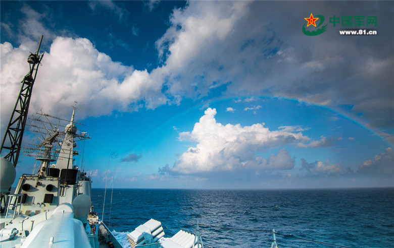 18:00—19:00,航行在祖国美丽的南海。海上气象瞬息万变,刚刚还是晴空万里,转眼就进入了雨区,等驶出雨区不久,海面上出现了美丽的彩虹,像是为辛苦忙碌一天的官兵们送上的礼物。