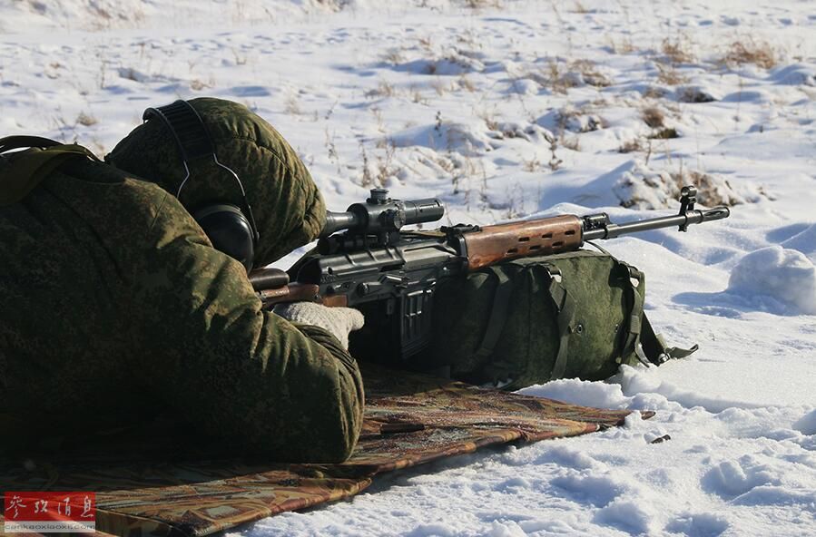 参演狙击手将背包作为SVD步枪的支撑物,匍匐位还铺好了衬垫,用于保温,还佩戴了降噪耳机,装备十分齐全。