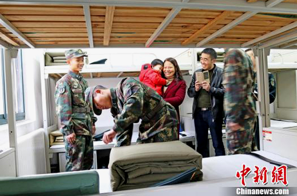 在火箭军驻洛阳某部,一批新训标兵亲属在部队的邀请下,走进了往日神秘的军营,战士们争相拿出“绝技”向家人们汇报部队训练成果,团聚的欢乐冲淡了退伍季的离愁别绪,也给远在家乡的战士亲属们吃了一颗定心丸。