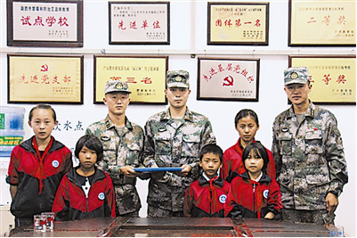 离开学校时,5名孩子来到大门口送别,赵兴存拉着罗熠的手依依惜别:“我很开心又多了一个‘兵爸爸’,但你也要记得回来看我啊!”(陈胜、马尧刚、张中强)