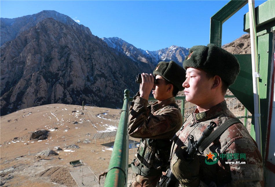 数十米高的哨楼上,哨兵们通过望远镜观察防区情况。