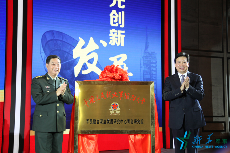 国防大学校长张仕波上将与青岛市委书记李群共同为“中国人民解放军国防大学军民融合深度发展研究中心青岛研究院”揭牌。欧蓓 摄