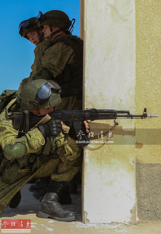 俄军士兵在拐角处警戒。