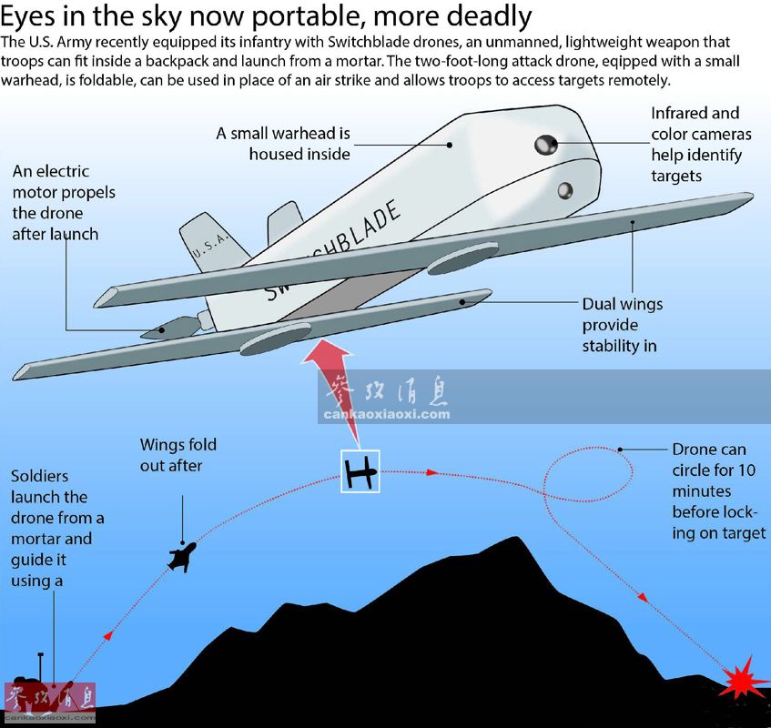 “弹簧刀”发射后,操作手(步兵)可通过机载高分辨率彩色摄像机传回的实时目标图像来监视和搜索目标,接到消灭命令后,步兵可通过PSP大小的掌上控制器锁定目标,“弹簧刀”就会收回机翼,以俯冲方式高速撞向目标,并引爆机载高爆弹头(威力与一枚40毫米榴弹相当)与其同归于尽。步兵可通过控制器目睹全过程,如果情况有变,还能遥控无人机中止攻击。图为“弹簧刀”无人机攻击躲藏在山后武装人员示意图。