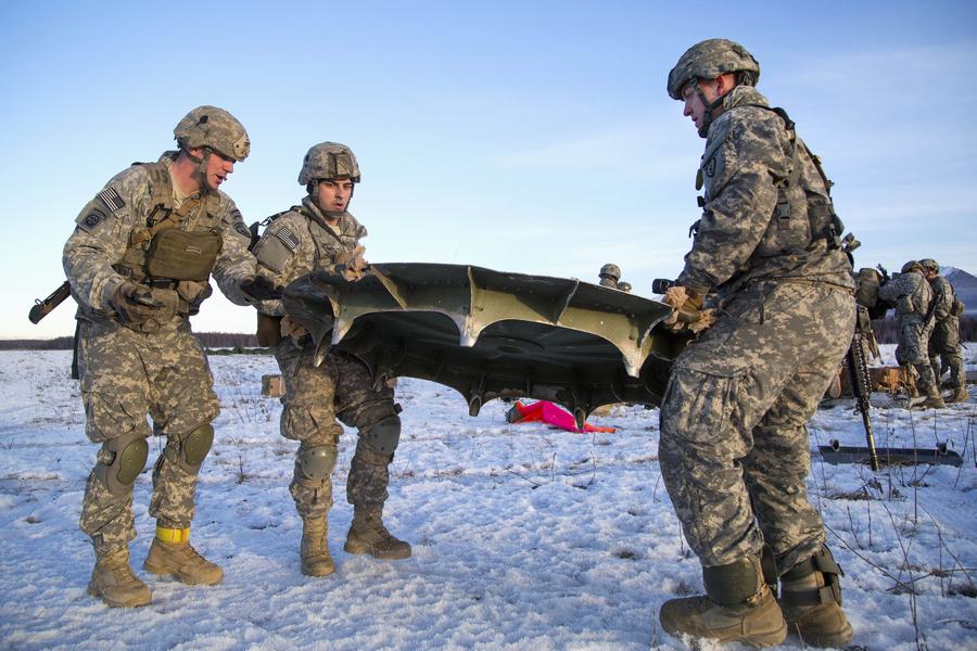 美国陆军空降兵在美国空军C17运输机的配合下,在阿拉斯加进行了雪地空投演习。