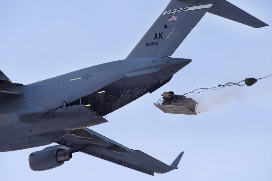美国陆军空降兵在美国空军C17运输机的配合下,在阿拉斯加进行了雪地空投演习。