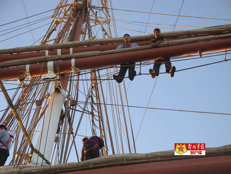 我们的三个学员被分在前桅杆的升帆组和主桅杆的升帆组,开始升降帆训练时,每个小组中都至少有一名业务熟练的舰员和学员一起,但只是起到监督和指导的作用,经过两次练习后,我们的学员对整个过程掌握得很好,在航程中都担任过本小组的指挥员,协调指挥本小组共同完成任务。