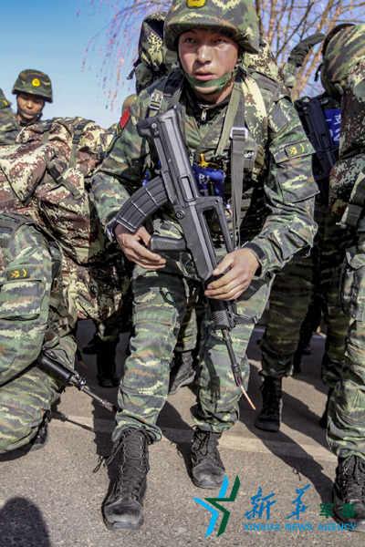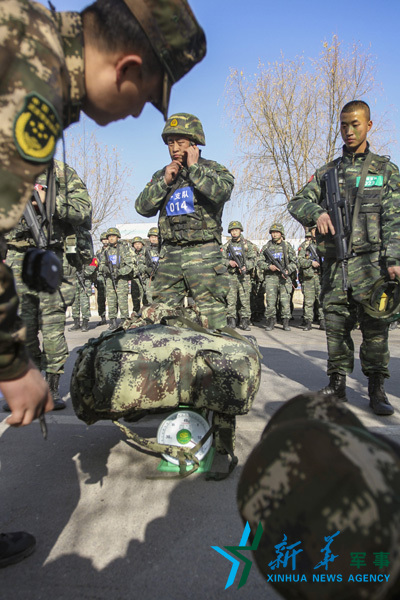 15日,被抽点称重的参赛队员,接受考核小组的检查。(负重必须按照战斗着装,携带武器,背囊装具不得少于20斤)
