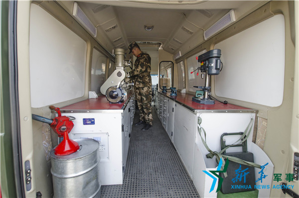 武警军械维修工程车配备小型机床、铣磨机、台钻、电焊等综合检修设备,极大的方便了在野战条件下轻武器的机件加工和应急检测维修。