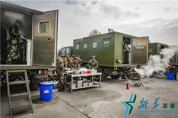 新华网兰州12月18日电 17日,天气格外寒冷。在野外宿营的武警甘肃总队冬季拉练部队完成训练课目一回到临时营地,就吃上了热气腾腾的六菜一汤。“现在的炊事装备真是好,让我们吃饭没有在外的感觉!”战士徐增博欣喜地说。