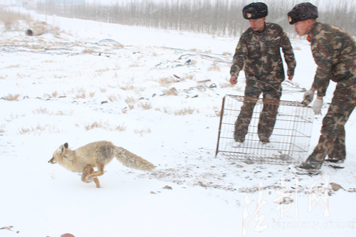 图为边检站前哨班官兵打开铁笼,已恢复行动能力的野生狐狸向高原纵深奔去 冯涛摄