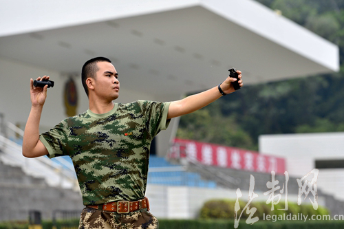 练兵场上空被投掷的防暴弹划出一条条优美的弧线。“八环、九环、十环……。”报靶员响亮的声音响彻练兵场。班长蔡锦彬投掷的防暴弹仿佛对靶心有向心力,一环比一环高;其他官兵也不甘示弱,刚刚创下的好成绩不断被刷新,战士廖国勇犹如赛场上的一匹黑马,凭着过硬的实力,一路过关斩将,夺得第一。(林宇华)