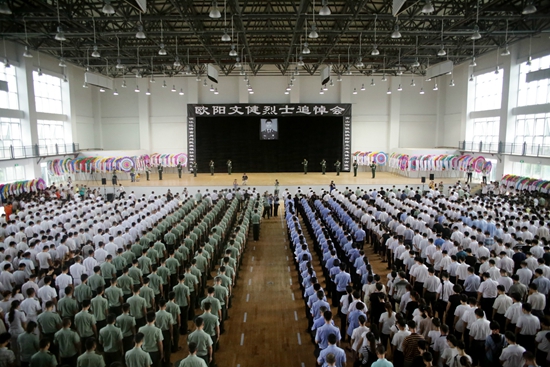 烈士欧阳文健,同样年轻。他生前是武警海南边防总队临高支队特勤分队战士。8月的海南,台风“电母”引发的洪水冲毁了家园。欧阳文健在营救被洪水围困的群众时,不幸被洪水卷走,壮烈牺牲,年仅22岁。追悼大会在临高县新文化馆举行。海南省政府有关部门领导干部、欧阳文健的父母、生前战友、家乡政府代表等社会各界万名干部群众赶到这里,一同送别心中的英雄。