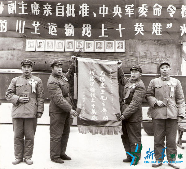 1969年1月19日,我连连长王守福、战士王任吉在北京接受总后党委代表中央军委授予“无限忠于毛主席的川藏运输线上十英雄”锦旗。
