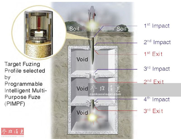 除射程远、精度高优势外,“金牛座”的另一大特点就是可打击坚固(或地下)目标,其配备有重454千克重的“靡菲斯特”串联钻地弹头,前级装药重约45千克,带有光电引信,首先利用高温射流在目标结构外部钻洞,然后主钻地弹头以每秒250米的高速钻入,可侵彻6米厚的钢筋混凝土或36米厚的土层,主弹头后配备有智能引信,可计算所侵彻过的地板和空间层数,按预先选定深度在内部引爆,确保最佳杀伤效果。图为“金牛座”的“靡菲斯特”钻地弹头攻击示意图。