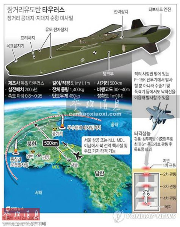 除以上特点外,“金牛座”另一优势是采用了雷达隐身设计,突防时可以低于30米的高度进行低空高速突防,进一步降低被敌方雷达截获的可能性。韩国空军是欧盟外的首个海外用户,共订购260枚,其中170枚已交付,计划在危机时刻,由F-15K战机投放,用于打击敌国核设施等要害目标。图为韩媒体制作的“金牛座”导弹打击敌国要害目标范围示意图,可见其500千米射程基本可覆盖敌国全境。