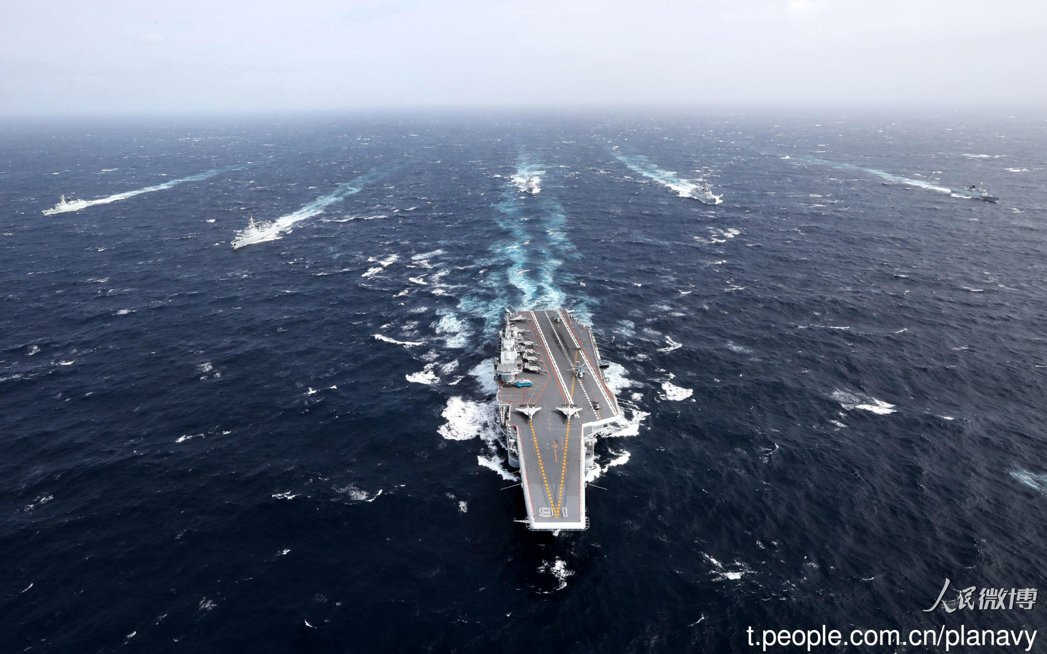 中国海军官方微博曝光辽宁舰舰艇编队远海训练的画面,图中辽宁舰被5艘各型舰艇严密防护,在大洋中劈波斩浪。