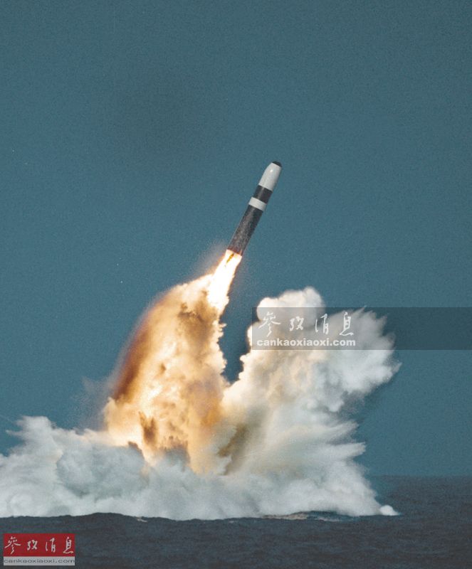 “三叉戟”Ⅱ型D5导弹已被部署在美国海军的俄亥俄级核潜艇和英国皇家海军的前卫级战略核潜艇上。该款三级弹道导弹的标准射程达4000海里,可携带分导式多弹头。