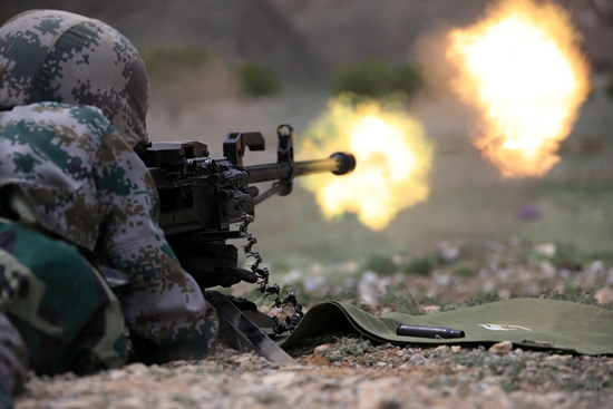 2016年4月25日,西部战区陆军某团机枪连官兵携带重机枪对“敌”目标实施火力打击。视觉中国供图(资料图片)