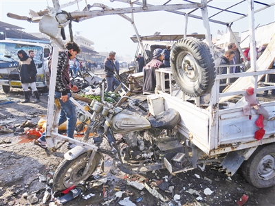 1月8日,在伊拉克首都巴格达,人们聚集在爆炸现场。当天上午巴格达发生一起自杀式汽车炸弹袭击,造成至少11人死亡、25人受伤。 新华社发