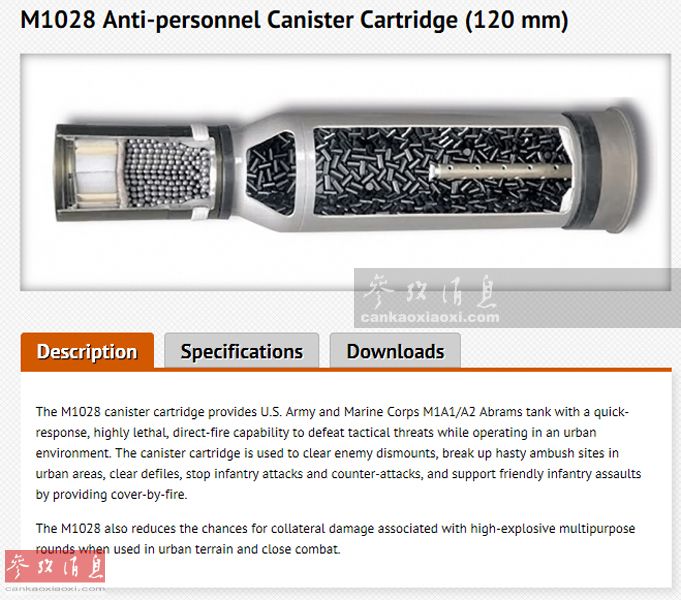 为解决这一问题,美军后来配备了通用动力公司研发的M1028炮射反人员霰弹。如图所示, 这种炮弹内装有1100颗钨钢弹丸,射入建筑物内引爆后,效果堪比一把巨型“霰弹枪”,可以击杀射程内的所有敌军人员,其最大有效射程700米。