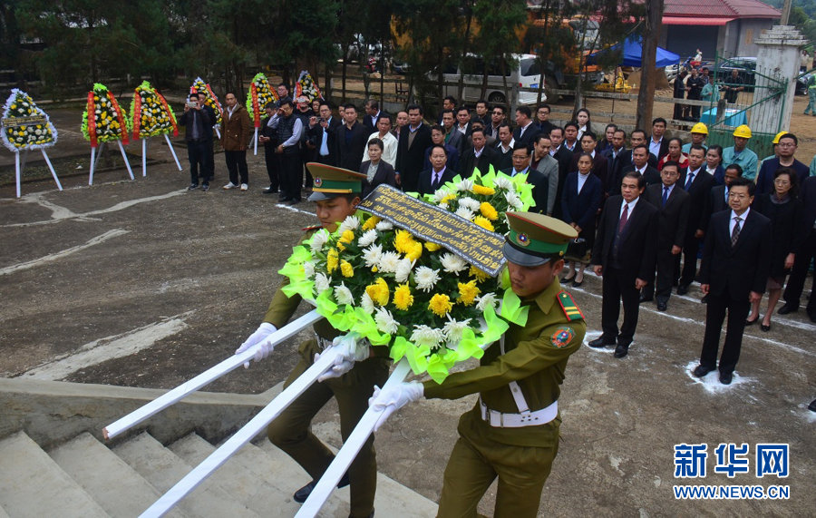 1月10日,在老挝乌多姆塞省纳莫县,工作人员向烈士陵园敬献花圈。新华社发(刘艾伦摄)