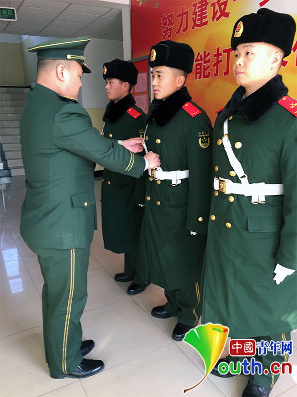 武警北京总队十六支队四中队哨兵上勤之前整理着装。中国青年网记者 开可摄