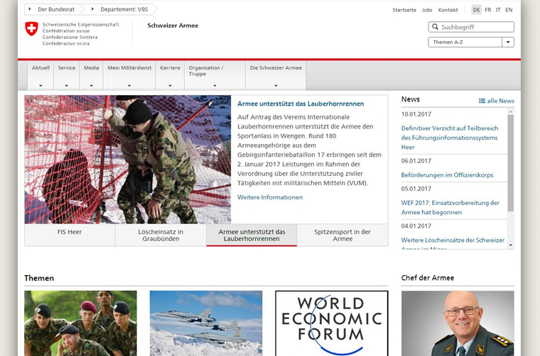 陆军野战部队主要部署在瑞士北部、东北部、中部和西部地区;山地部队全部部署在阿尔卑斯山地区;国土防御师沿北部、东北部和东南部边境地区部署。