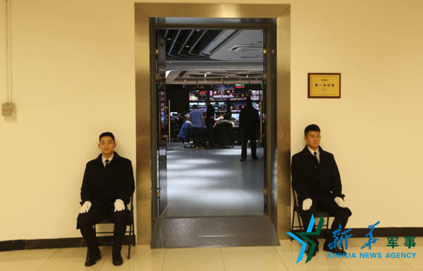 1月23日,武警官兵在春晚彩排现场守卫导控中心。