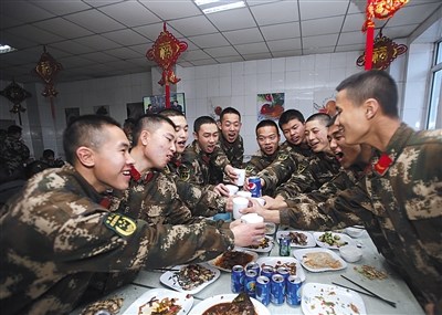 1月27日,除夕,新疆塔什库尔干县,红其拉甫边防检查站,官兵们相聚在食堂一起吃年夜饭。