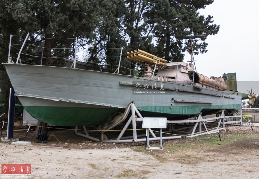 图中这艘P4级鱼雷艇算是大有来头,是以军在1974年“赎罪日”战争期间从埃及缴获的,而这艘P4级实际是中国海军于20世纪50年代推出的仿制版,与苏军版的区别是均加装有对海搜索雷达。该级艇满载排水量仅22.4吨,最大航速55节,主武器为2个450毫米重型鱼雷发射管和2挺12.7毫米重机枪。位于指挥台前方的八联装多管火箭炮应是埃及后来加装的。