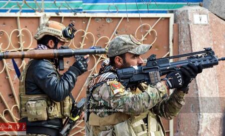 图为伊军特战队员使用VHS-K2(紧凑型)突击步枪和RPG-7火箭筒在摩苏尔与IS武装分子交火。