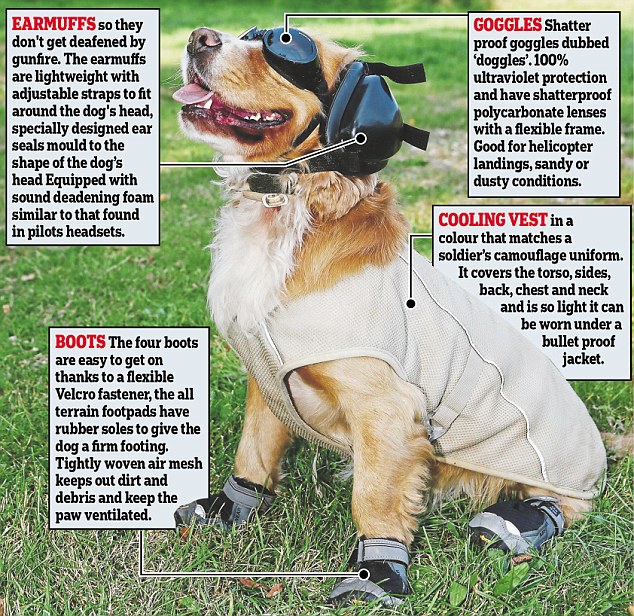 眼镜由防碎镜片打造,可以百分百防紫外线伤害,耳罩完全根据狗狗的脑袋形状制造,可以有效保护巡逻犬的耳朵不被炮火的声音伤害,而防弹背心有降温功能,同时也有保护色的作用。