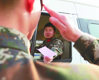 2月13日,陆凯在跟哨兵做出入营门手续交接。