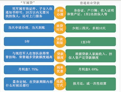 除了利息优惠,下各镇专武部长潘再平一口气列举“军属贷”的其他利好:一是还贷期较长,普通商业贷款还款期限为1至3年,而“军属贷”可延至5年;二是担保方式简单,20万以内子女担保即可,不需另找其他担保人;三是办贷手续便捷,只需带上身份证和子女的入伍通知书就能办理。此外,一般可为军属贷款20万元,子女在部队立功受奖获得荣誉多的,凭相关证明还可以提高贷款额度。