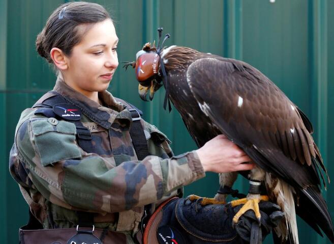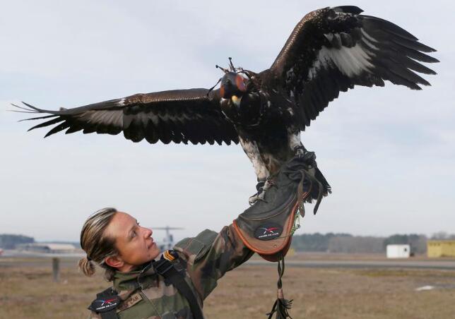 当地时间2月10日,在法国西南部的蒙德马桑空军基地,训鹰军人正在训练金雕,希望利用它凶猛的捕猎能力“对付”非法飞行的无人机。(潘一侨)