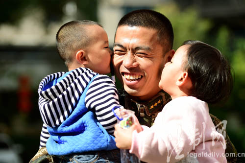 图为两位小朋友给曾云强中队长深情一吻