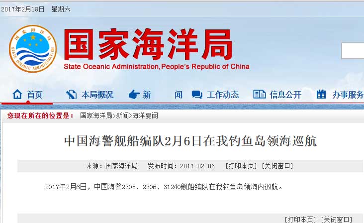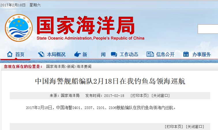 新华网北京2月18日电 据国家海洋局网站报道,2017年2月18日,中国海警2401、2337、2101、2106舰船编队在我钓鱼岛领海内巡航。