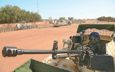 近期,马里局势日趋动荡,恐怖活动十分猖獗。中国第四批赴马里维和部队警卫分队全体官兵枕戈待旦、妥善应对。图为官兵正在执行护卫任务。谢华摄