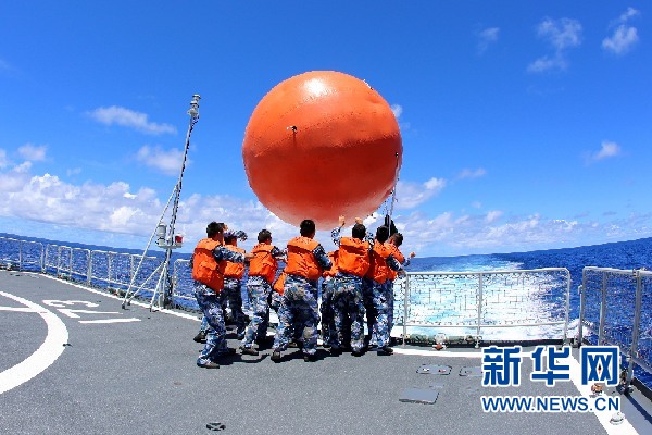2月19日,在海上现场反击演练中,长沙舰舰员在飞行甲板上向指定海域布放模拟“敌舰”的漂浮靶标。