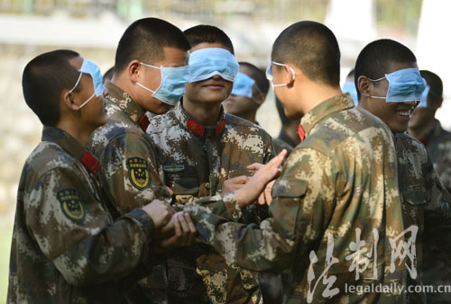 图为战士们正在开展“我的战队”历奇游戏,在不可视、不说话条件下找战队